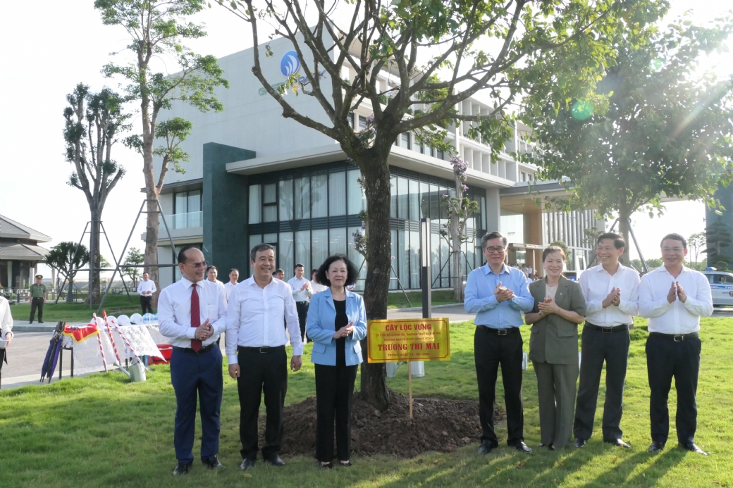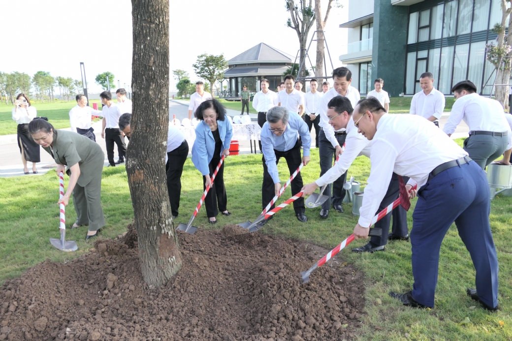Bà Trương Thị Mai và lãnh đạo tỉnh Thái Bình trồng cây lưu niệm tại khuôn viên công ty Green i-Park
