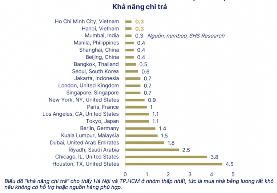 Tổng hợp từ cơ sở dữ liệu của Numbeo, bộ phận nghiên cứu của Chứng khoán SHS trong báo cáo mới đây nhận định hệ số giá nhà so với thu nhập của Việt Nam đang ở mức cao nhất thế giới. Đến giữa năm 2025, chỉ số này đã chạm ngưỡng 27,3, tức giá một căn hộ trung bình cao gấp hơn 27 lần thu nhập bình quân của 1 hộ gia đình.