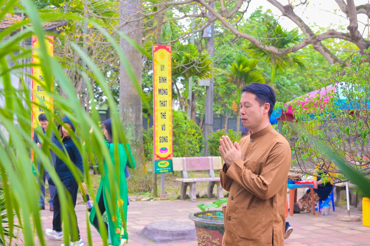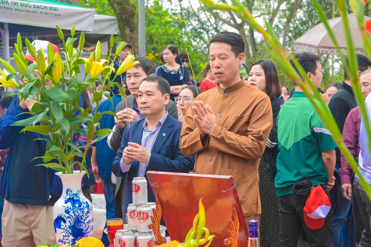 Từ sáng sớm, Đoàn đã khởi hành trong không khí phấn khởi, háo hức. Mỗi bước chân như đang đưa chúng tôi ngược dòng thời gian, trở về với những trang sử hào hùng của dân tộc. Khói trầm quyện trong tiết trời xuân se lạnh tạo nên không gian linh thiêng, trang nghiêm. Sân đền rực rỡ sắc đào, quất cảnh và cờ hội.