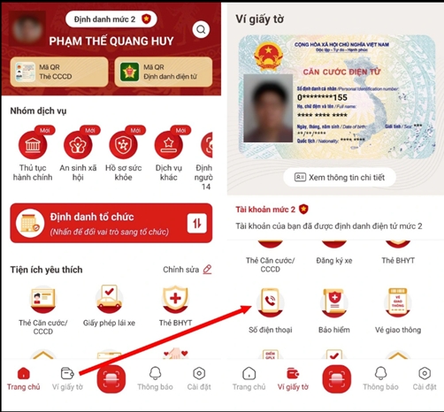 - Từ giao diện chính của ứng dụng, nhấn vào “Ví giấy tờ” tại menu phía dưới, chọn “Số điện thoại” từ danh sách hiện ra.